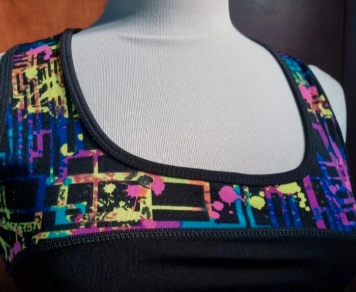 Débardeur noir à motifs multicolore taille 36-38, longueur 57cm, largeur 35cm, largeur aisselle à aisselle 40cm, longueur épaule à aisselle 22cm.