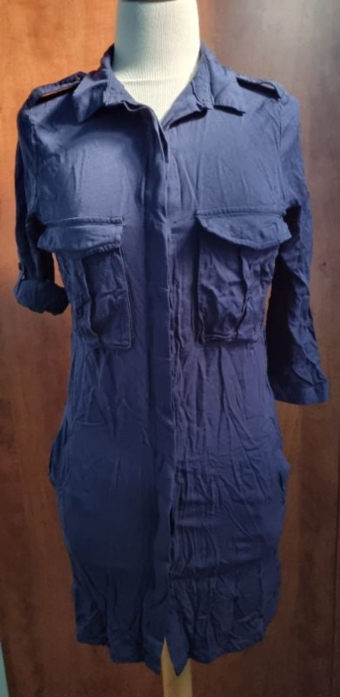 Robe à fermeture boutons avec multiples poches, taille M marque Jennyfer, manches retroussable, possibilité de mettre une ceinture, longueur 84cm, largeur 40cm, longueur épaule à aisselle 17cm, largeur épaule à épaule 35cm, longueur manche 41cm, longueur manche retroussé 26cm.