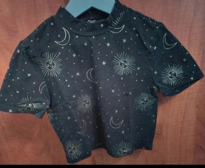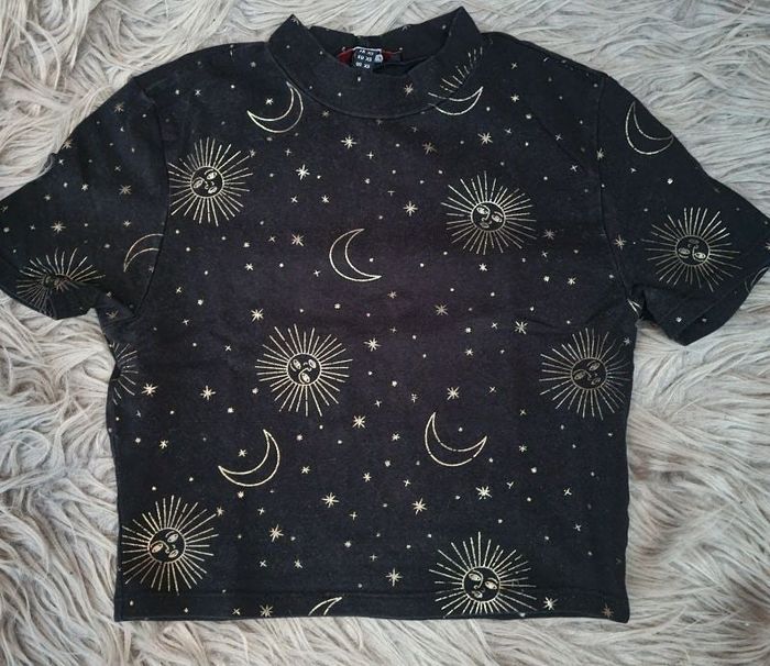 T-shirt crop top à motifs doré, marque Jennyfer taille XS, longueur 35cm, longueur épaule à aisselle 13cm, largeur 31cm.
