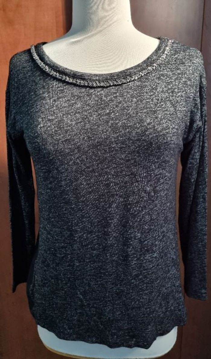 Pull léger noir gris avec perles au col taille 40