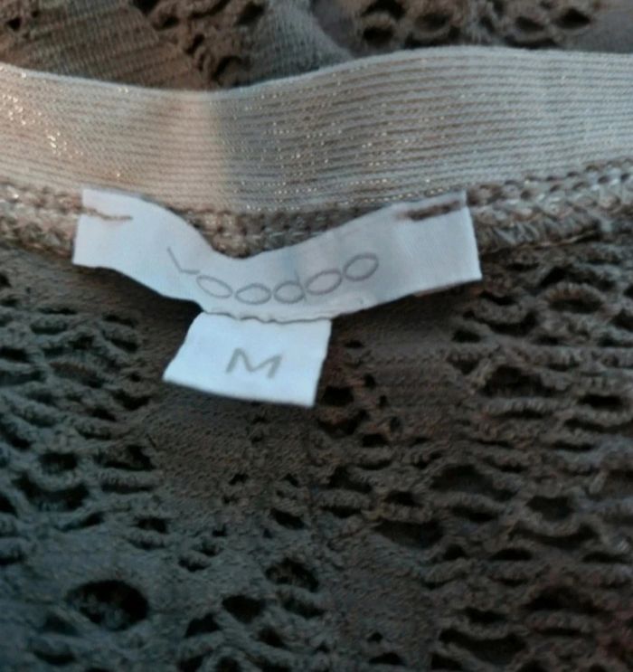 T-shirt ajouré gris ,pailleté au col et aux manches, taille M marque Voodoo,longueur 59cm, largeur 42cm, longueur épaule à aisselle 21cm.