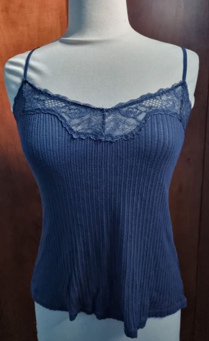 Bustier bleu avec effet dentelle, taille Unique (du 36 au 40),bretelles réglable, élastique, longueur sans bretelles 46cm, largeur 36cm jusqu'à 40cm,marque Monoprix.