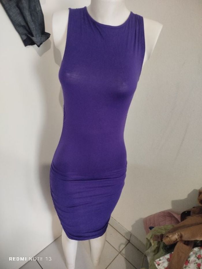 #kytie38femme. Robe sans manche taille 38 violette toute élastique dos nue mesure hauteur 105 cm en excellent état peut-être légèrement transparente sur piqué élastique sur chaque côté de marque TOP STUDIO ref C89