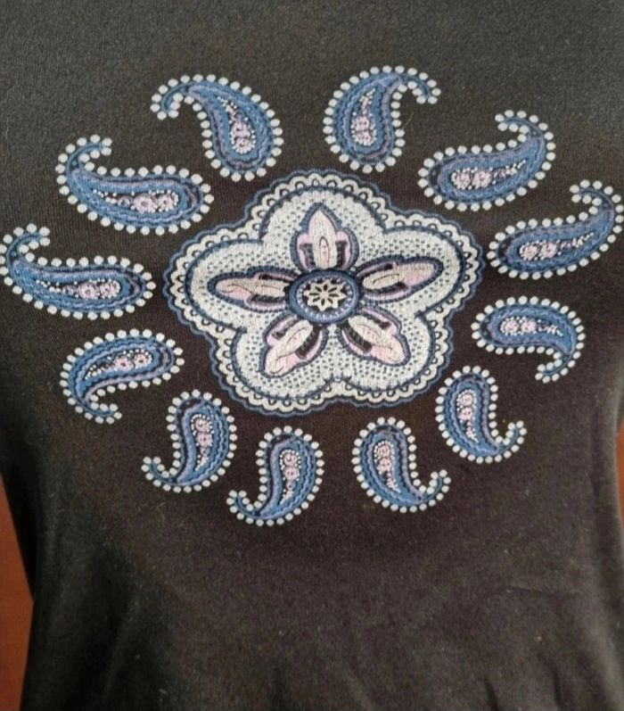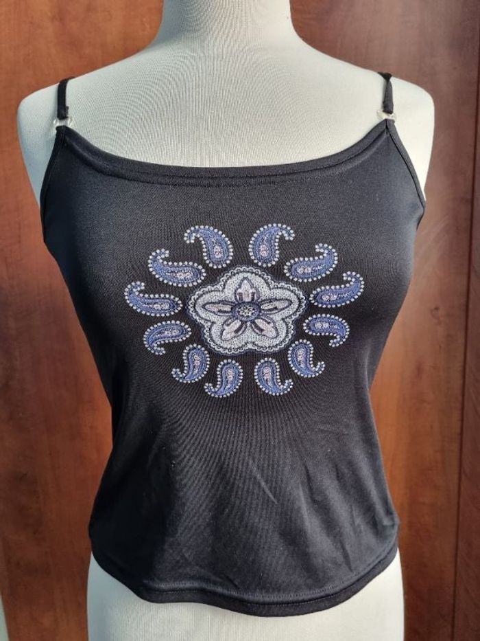 Débardeur court à bretelles noir avec rosace imprimé taille S,longueur 40cm, largeur 36cm.