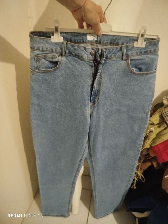 #kytie44femme. Jeans MOM taille 44 de marque Kiabi bleu ciel en état neuf zippé avec un bouton poche avant et arrière mesure de la taille 44 cm tour de cuisse 65 cm hauteur 100 cm cheville 35 cm réf 897