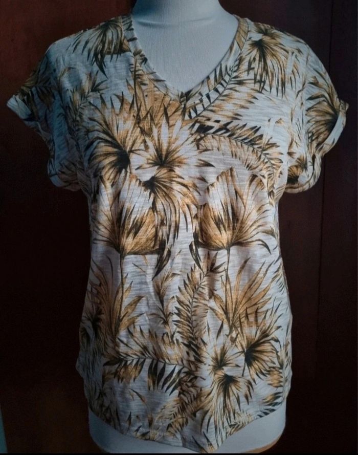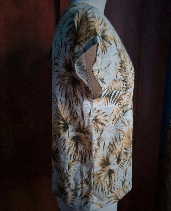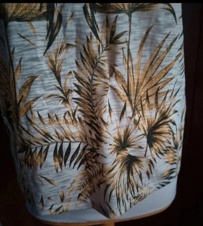 T-shirts imprimé motifs feuilles tropical, taille S marque Fransa,longueur 62cm, largeur 49cm, longueur épaule à aisselle 18cm, neuf avec étiquette (acheté comme ça sur vintd il y a un trous recousu voir dernière photo).