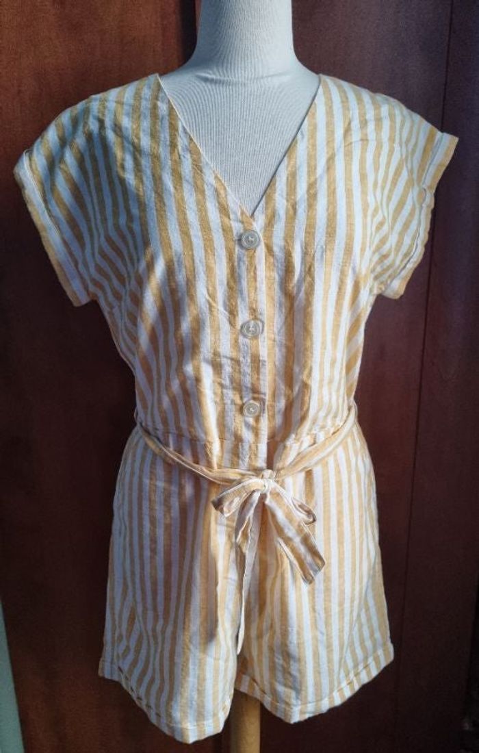 Combi-short à rayures blanches et jaunes, fermeture boutons avec ceinture intégré, poches sur les côtés ,taille 38 marque ICHI,combinaison doublure intégré, longueur 86cm, largeur 45cm, longueur épaule à aisselle 22cm, largeur épaule à épaule 58cm, largeur cuisse 34cm, neuf avec étiquette (acheté sur vinted il y a un trous recousu qui se vois peu ,voir dernière photo).