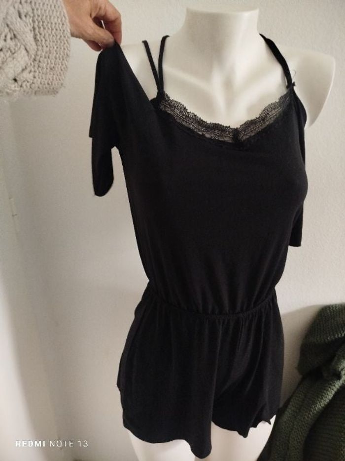 #kytieXSfemme. Combishort taille XS/S hultra fine manches épaules dénudées lassage dos col v a dentelle neuve noir mesure des épaules 32 cm des aisselles 40 cm hauteur 65 cm en viscose et élastique taille élastique ref J56