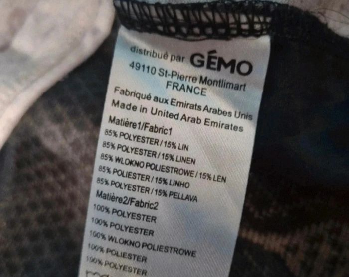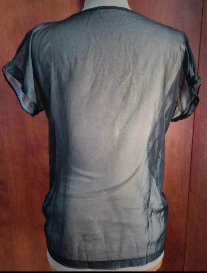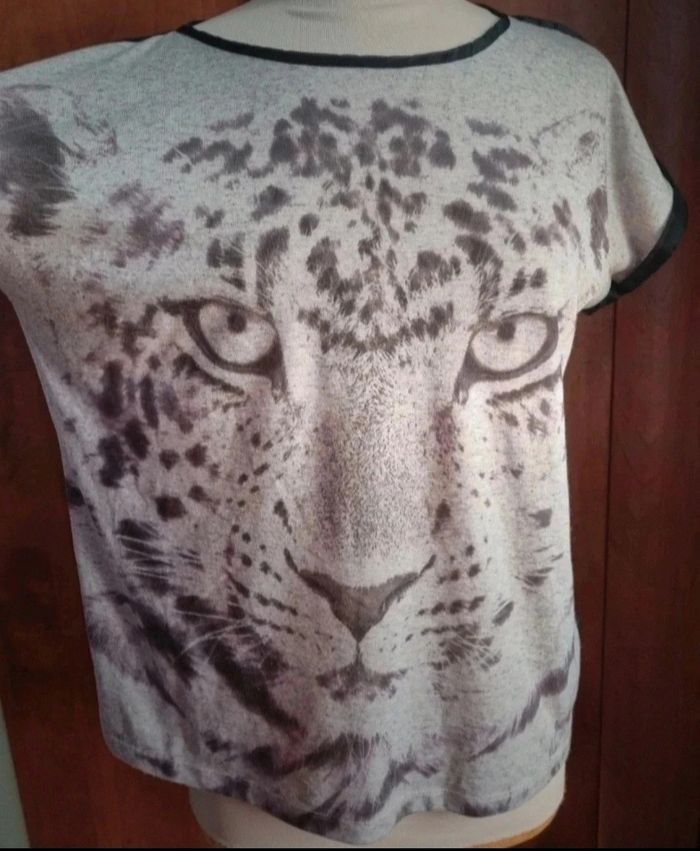 T-shirt gris avec tête de léopard,noir transparent à l'arrière, taille 42-44 marque Gémo, très léger, longueur 63cm, largeur 51cm, longueur épaule à aisselle 20cm.