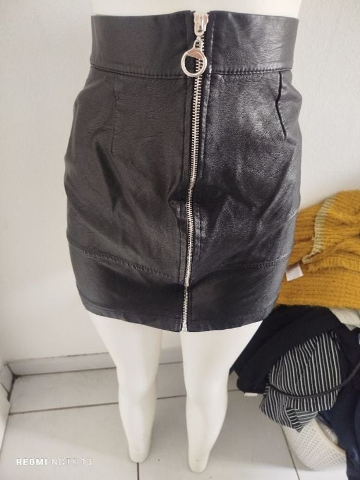 #kytieLfemme. Jupe taille L noir en cuir synthétique écrit taille taille très petit mesure de la taille 36 cm élastique hanches 45 cm hauteur 42 cm en excellente état comme neuf ref 890