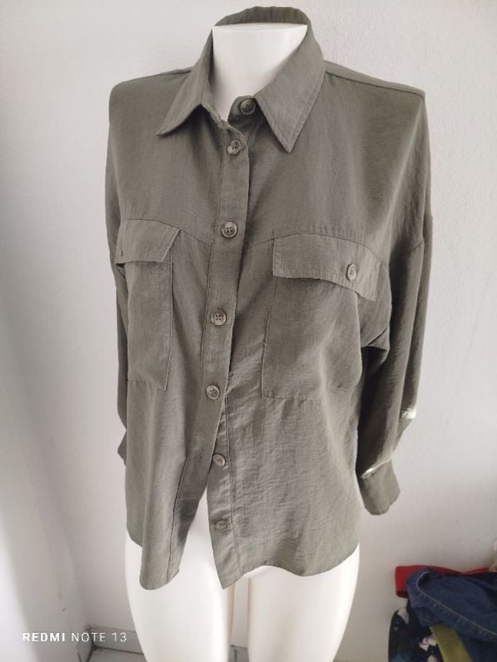 #kytie38femme. Chemise fluide manches longues taille 38 de marque Primark kaki effet vague 🌊 neuve poche avant sur la poitrine en état neuve 100 % polyester mesure des épaules 60 cm des aisselles 58 cm hauteur devant 65 hauteur derrière 70 cm les manches arrivent au niveau du coude ref K34