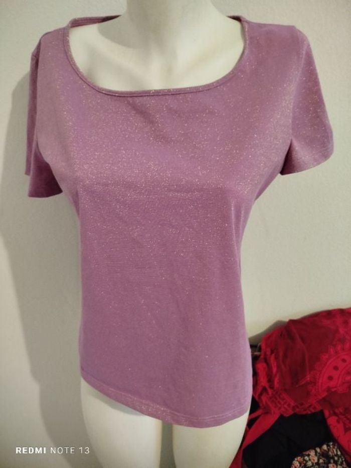 #kytie38femme. Tee-shirt manches courtes taille 38 de marque public lilas et or col rond en état neuf mesure des épaules 38 cm des aisselles 48 cm hauteur 60 cm réf 109