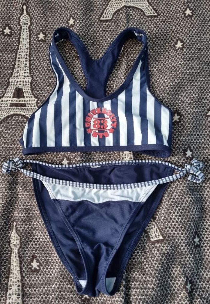 Maillot de bain 2 pièces bleu marine et blanc avec écriture, taille 10ans.