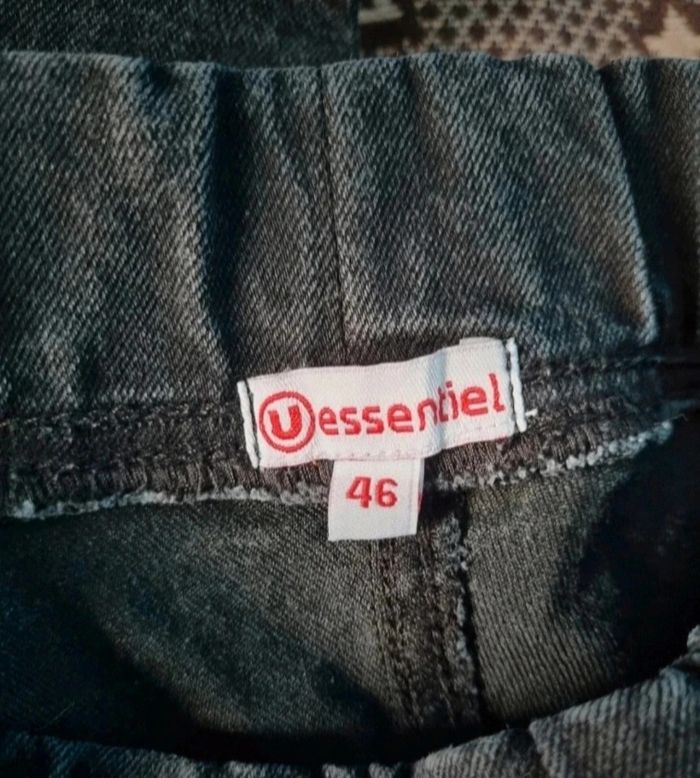 Jean noir gris taille 46,élastique à la taille, marque U essentiel, longueur 101cm, largeur de la taille 44cm jusqu'à 48cm, largeur cuisse 32cm, largeur cheville 18cm,fausse poches à l'avant, vrais zip à l'arrière.