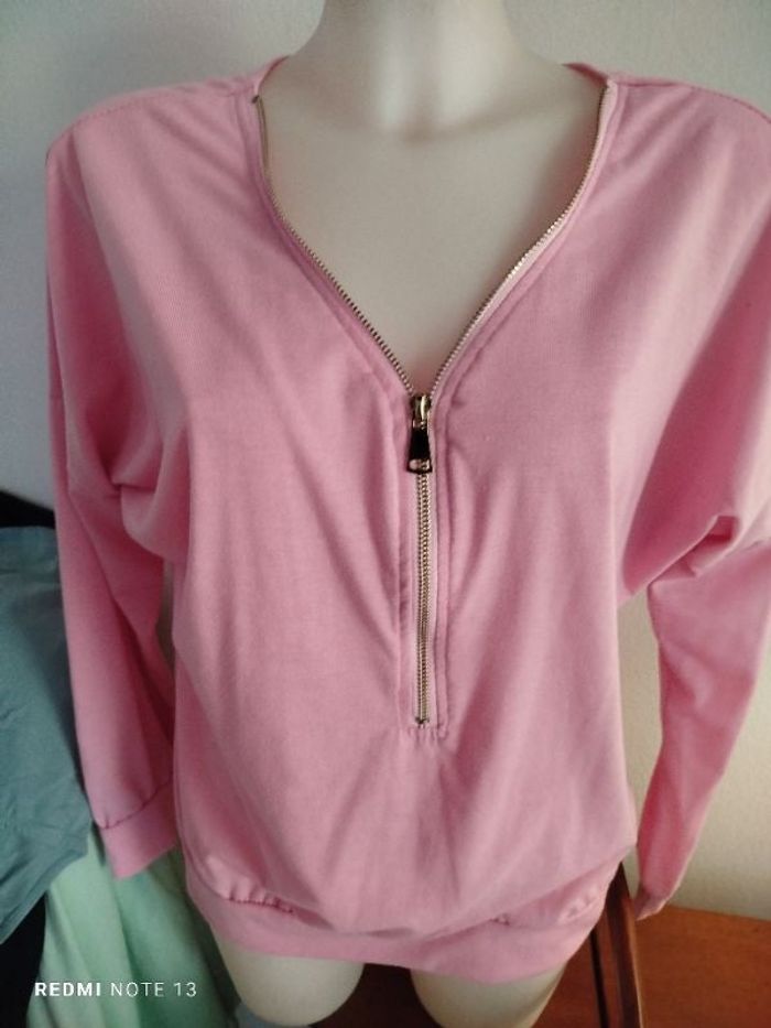 #kytieLfemme. Tee-shirt manches longues taille L/XL col v zippé doré de couleur rose fluide et souple mesure des épaules 72 cm des aisselles 56 cm hauteur 65 cm en excellente état tissu très très doux et élastique et viscose et coton en excellente état comme neuf ref 42
