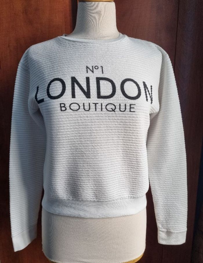 Sweat avec écriture tailleS marque Jennyfer, longueur 50cm, largeur 47cm, longueur épaule à aisselle 20cm, longueur manche 55cm,recousu à une manche mais se voit peu.