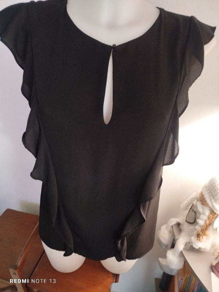 #kytie32femme. Top en voile sans manche taille 32 noir volant au manche mesure des épaules 32 cm aisselles à aisselles 40 cm hauteur 60 cm se ferme par un petit bouton devant au niveau du cou ouvert au volant sur les côtés jusqu'en bas en polyester et en viscose en état neuf de marque made in Italy dégriffé ref MD34