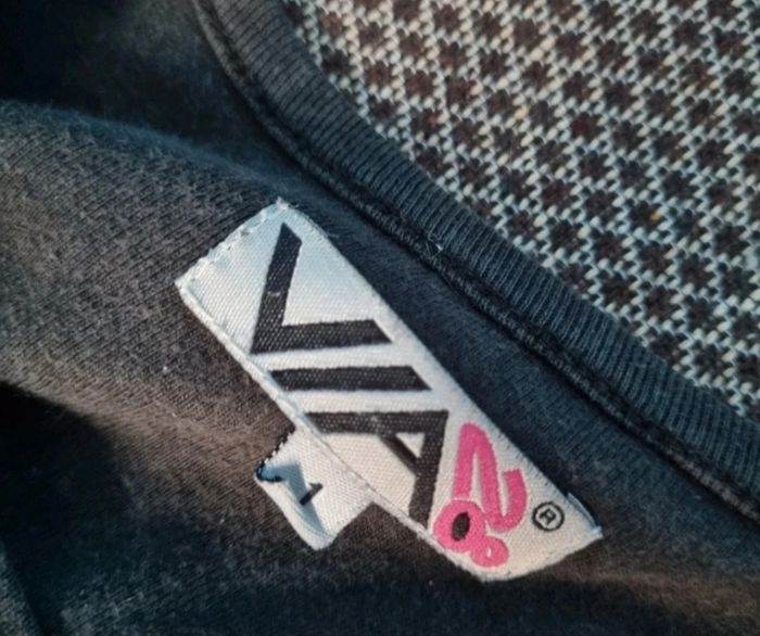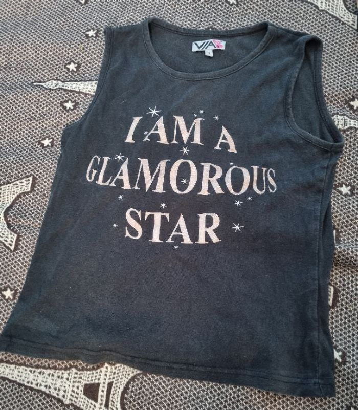 Débardeur noir avec écriture, taille 1 marque Via28, longueur 48cm, largeur 40cm, longueur épaule à aisselle 17cm,écriture légèrement craquelé.