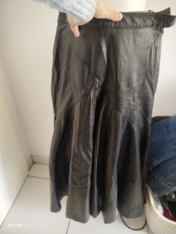 #kytie34femme. Jupe en cuire zippé évasé taille 34 avec un bouton mesure de la taille 34 cm hauteur 85 cm en état neuve doubler synthétique ref CP34