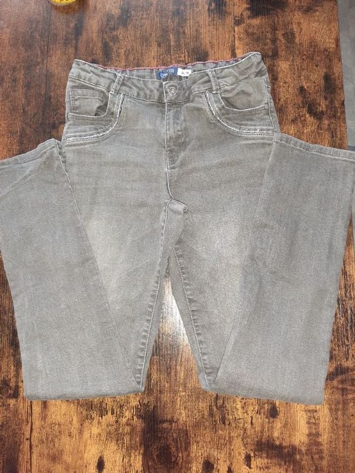 Okaïdi jean slim gris 14 ans. Contour poches ornés strass. Taille intérieure réglable. Coton majoritaire et élasthanne. Quasi neuf...