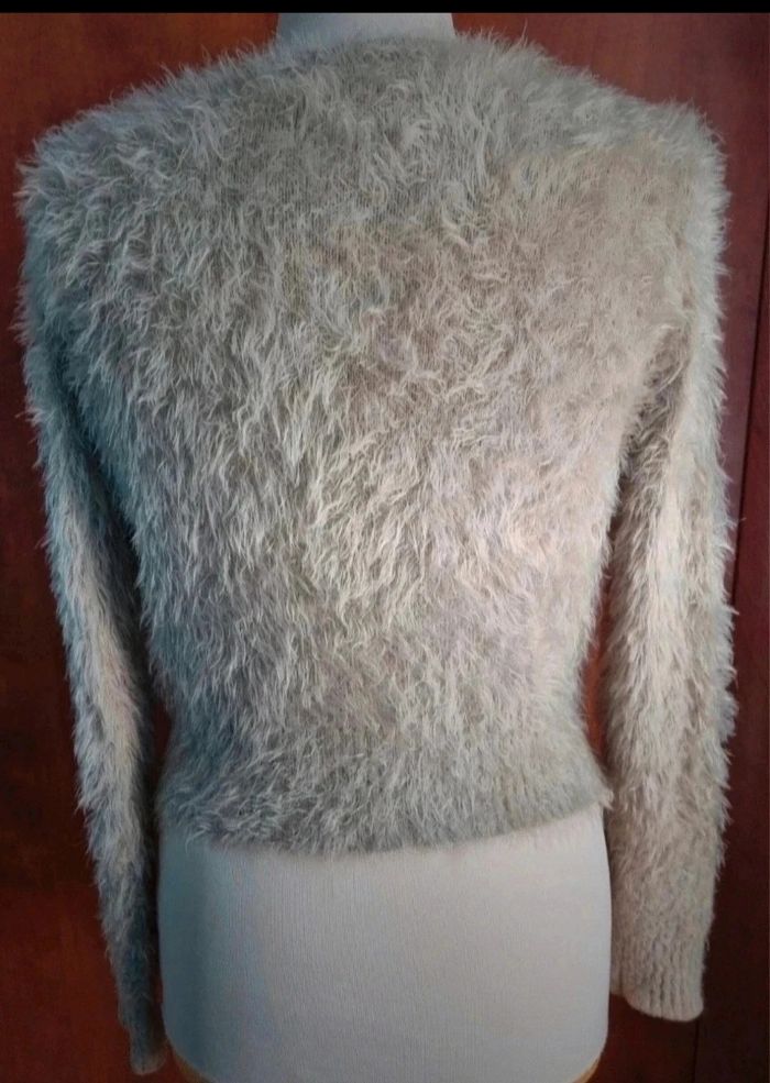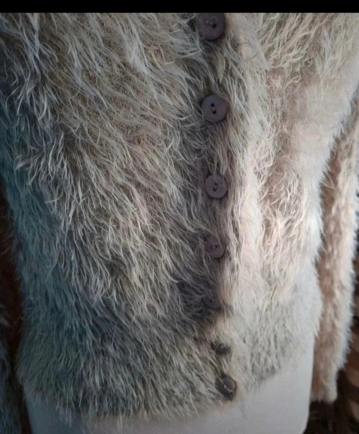 Cardigan fausse fourrure et effet laine,taille 40-42, fermeture boutons, longueur 46cm, largeur 44cm, longueur épaule à aisselle 17cm,doux au touché.