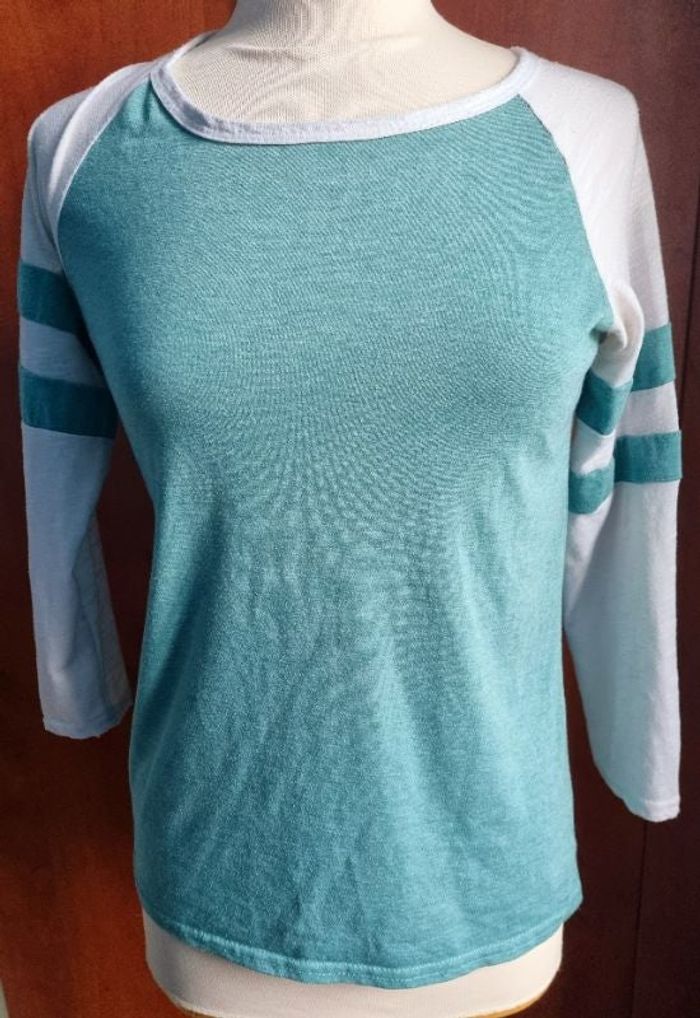 Pull léger vert clair et blanc, taille S,longueur 61cm, largeur 45cm, longueur épaule à aisselle 22cm, longueur manche 56cm, largeur épaule à épaule 43cm.