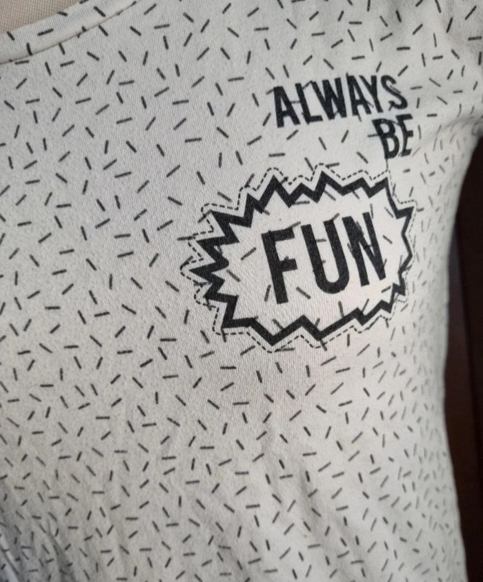 T-shirt à motifs (style confettis),taille S marque Kiabi, longueur 53cm, largeur 43cm, longueur épaule à aisselle 17cm.