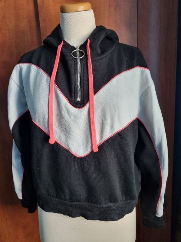 Sweat à capuche noir blanc et rose fluo,taille M,marque Jennyfer, longueur 51cm, largeur 54cm, longueur épaule à aisselle 24cm, longueur manche 51cm.