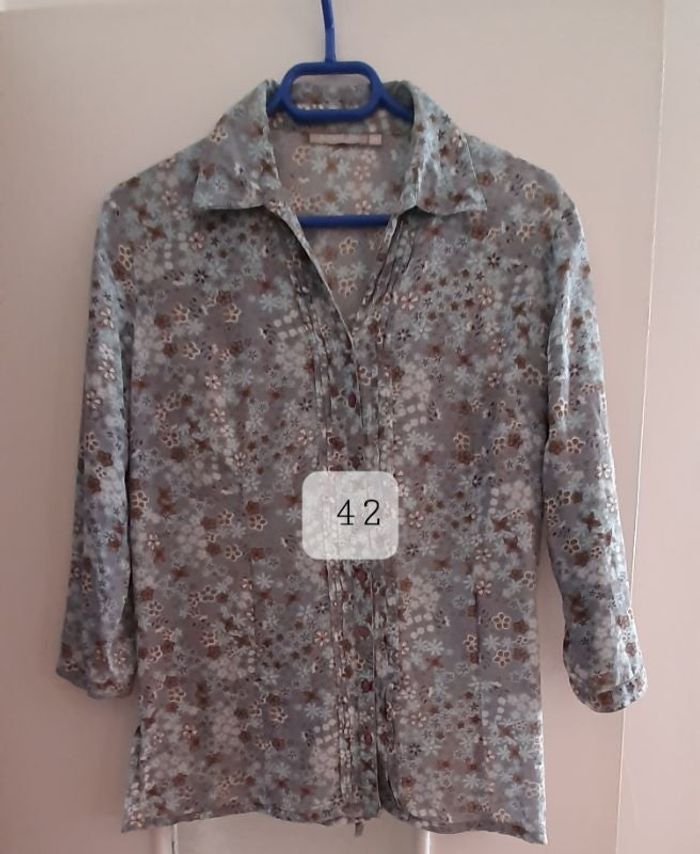 Tunique Daxon. Coupe classique. 42. Coton. Fente côtés. Petit cordon dos. Manche 3/4. Coloris gris bleuté/marron clair.
