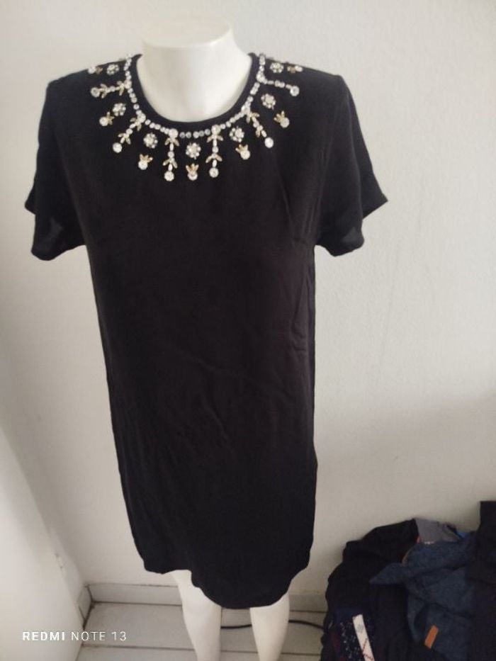 #kytieLfemme. Robe manches courtes taille L de marque jolie jolie petit soir doublé envoie épée avec de perles strass au niveau du col qui fait tout le tour se ferme par un petit bouton dans le cou derrière en état parfait en état du neuf 100 % viscose le tissu en parallèle et la doublure mesure des épaules 38 cm un peu juste pour un 40 mesure des aisselles 48 cm hauteur de la robe 85 cm réf PSJ34