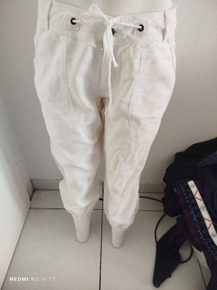 #kytie40femme. Pantacourt taille 40 de marque Kwoman 'euf blanc mollet élastique zippé avec une fermeture éclair et un cordon de serrage à la taille poche avant avec un bouton de rechange 55 % lin 45 % coton transparent du coup légèrement mesure de la taille 42 cm tour du cuisse 60 cm hauteur 80 cm et mollet 30 cm réf KW34