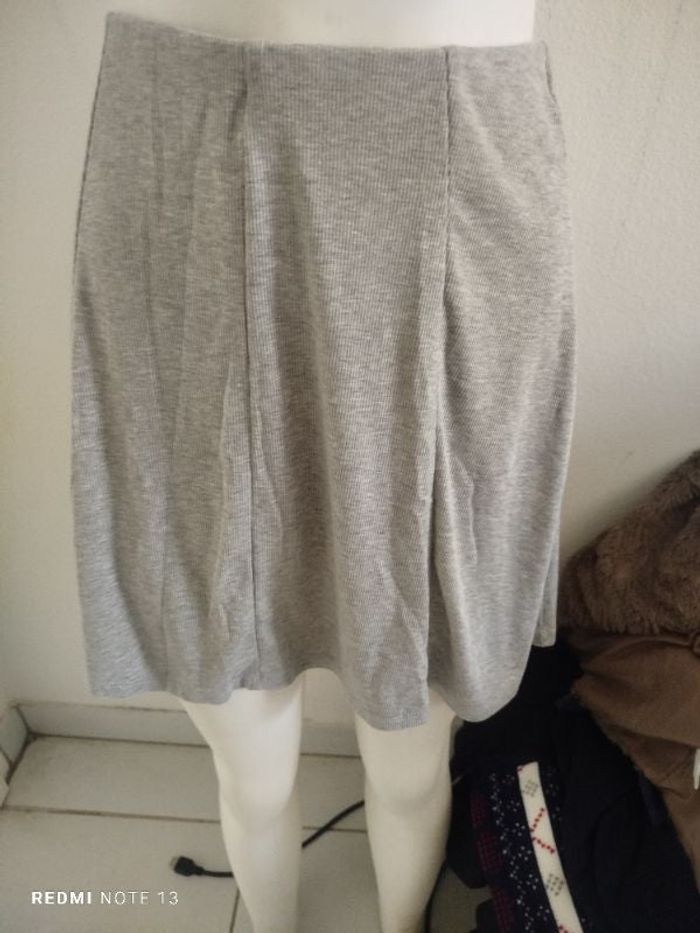 #kytieSfemme. Jupe taille se de marque Pimkie côtelé fine et légère gris clair neuf taille élastique fluide mesure de la taille 34 cm hauteur 45 cm 63 % polyester 34 % viscose 3 % élastique ref 34P