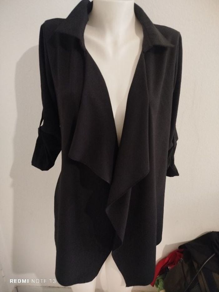 #kytie38femme. Veste chemise manches longues retroussable taille 38 noir avec sa ceinture en état neuve 60 % polyester 35 % viscose 5 % énergétique mesure des épaules 38 cm des aisselles 48 cm hauteur 80 cm réf 320 made in Italy