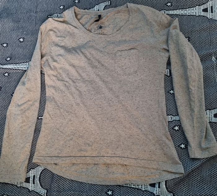 Sweat beige à reflet gris clair et point noir,plus long à l'arrière, taille 42-44, longueur avant 59cm, longueur arrière 64cm, largeur 42cm, longueur épaule à aisselle 19cm, longueur manche 57cm.