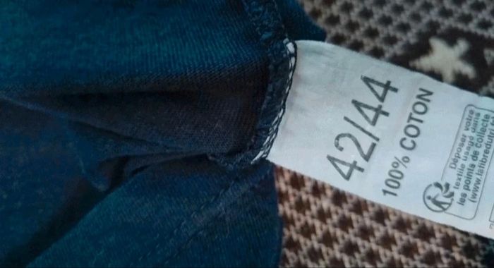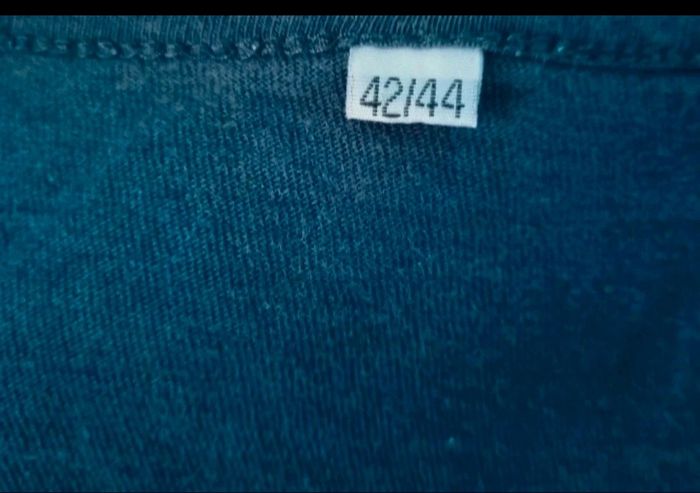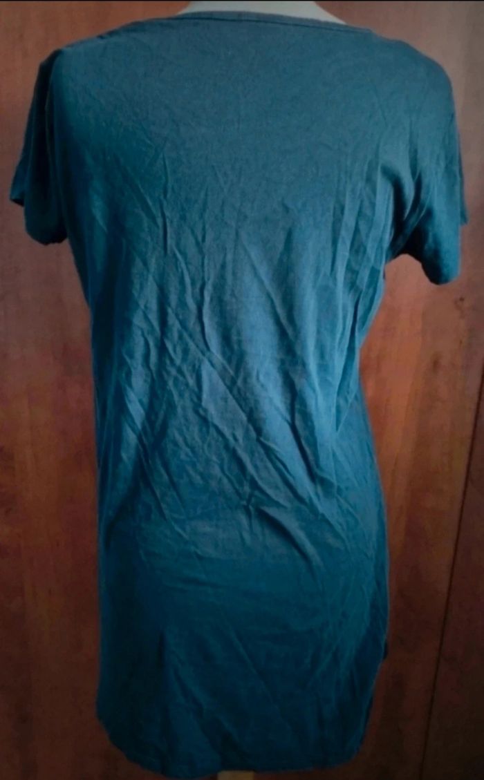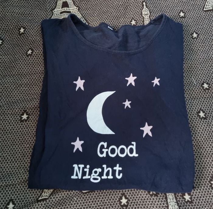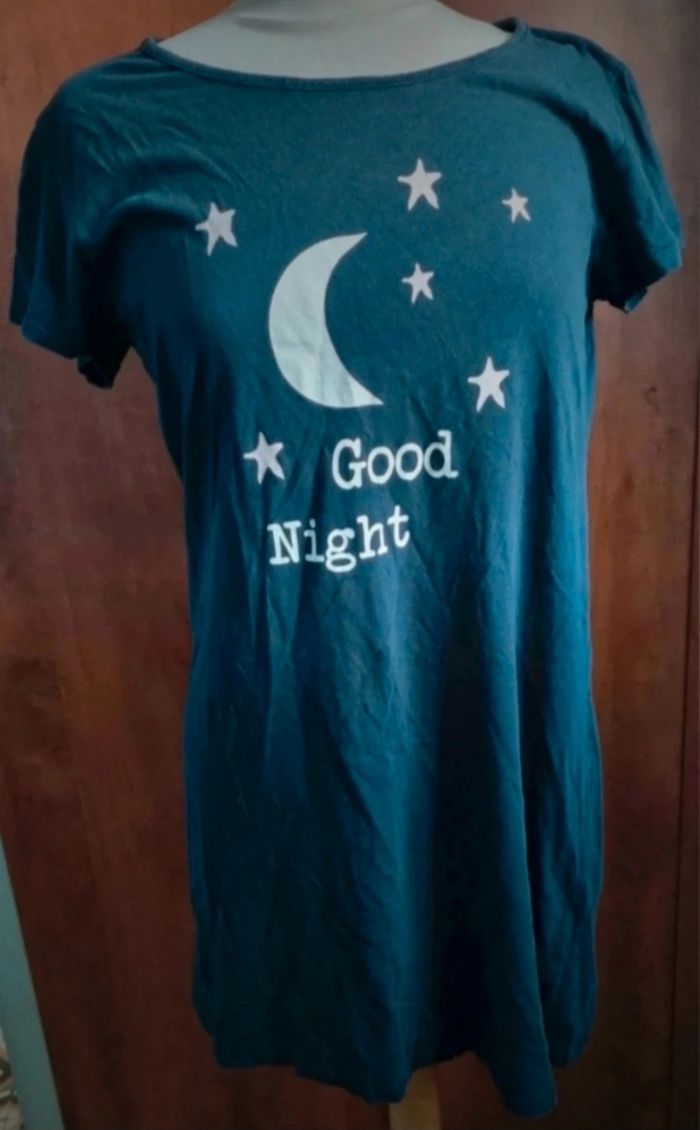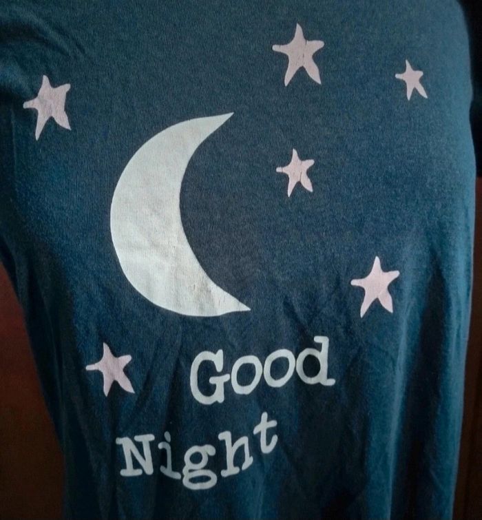 Robe de nuit bleu marine, avec écriture et motif étoiles et lune (légèrement craquelé), taille 42-44, longueur 80cm, largeur 47cm, longueur épaule à aisselle 19cm, largeur épaule à épaule 43cm.