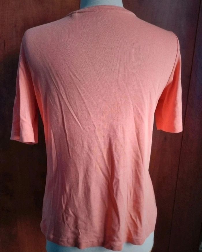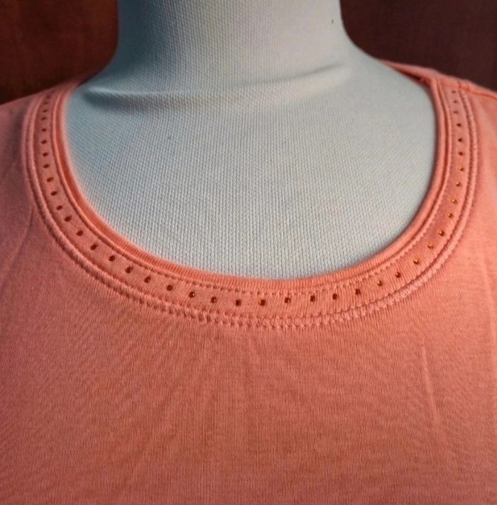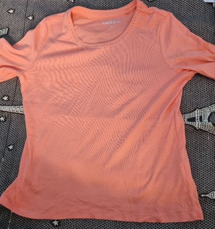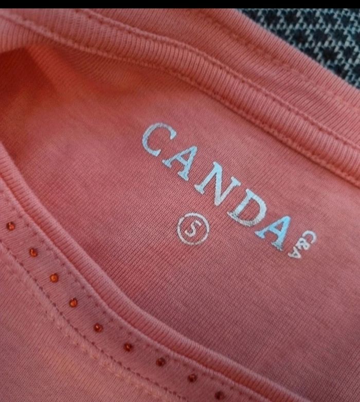 T-shirt taille S, marque Canda,strass au col,longueur 60cm, largeur 46cm, longueur épaule à aisselle 19cm,couleur corail.