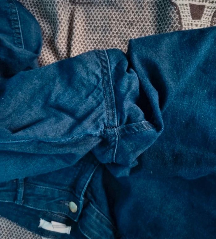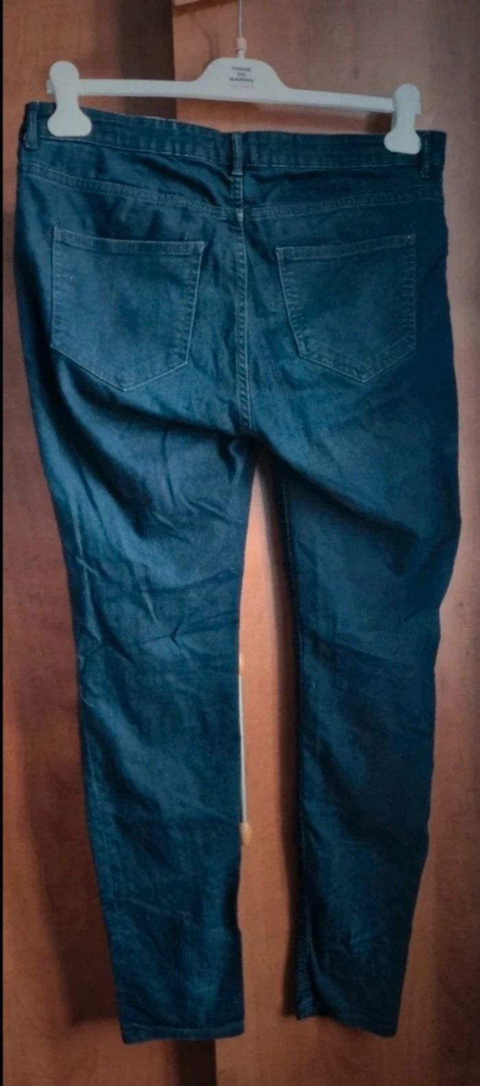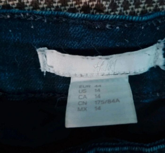 Jean bleu marine taille 44,marque H&M, longueur 101cm,largeur de la taille 45cm jusqu'à 49cm (élastique),largeur cuisse 26cm, largeur cheville 16cm.