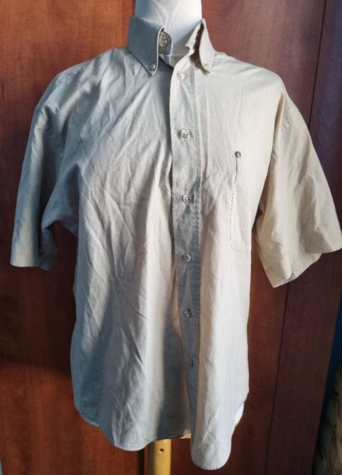 Chemise uni à manches courtes ,beige clair, marque Laurant Cerrer,taille L,longueur 71cm, largeur 52cm, longueur épaule à aisselle 25cm, longueur manche 26cm.