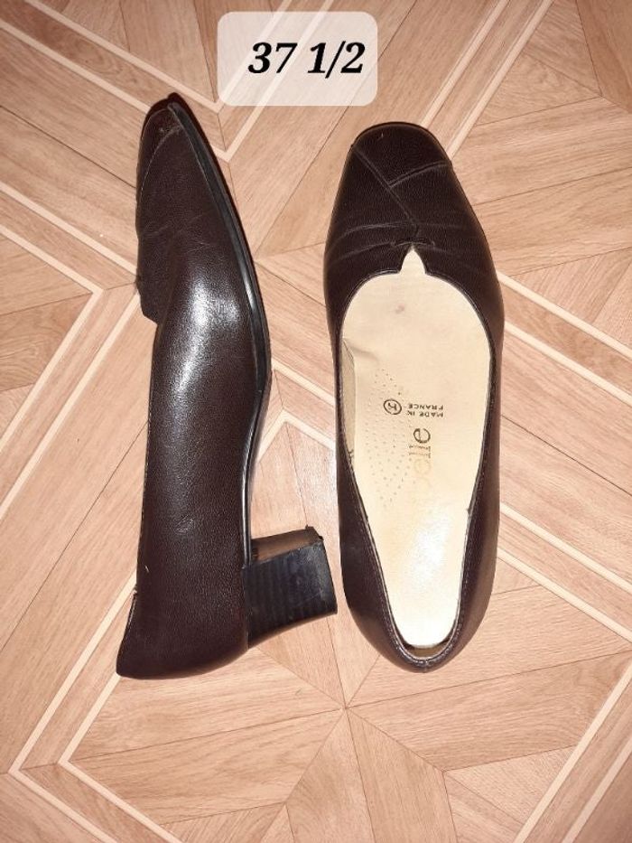Mocassin 37 1/2 marron. Cuir. Le bout de la chaussure est marron un peu plus clair Talon : 4,5 Dessus et intérieur cuir. Semelle élastomère. Petite ouverture sur le dessus pour + de confort Très propres (intérieur, extérieur) De mémoire il s'agit d'un achat chez Damart
