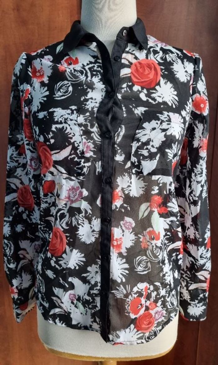 Chemise à motif rose rouge taille XS,très transparente,marque Jennyfer, légère agréable pour l'été, 2 poches, longueur 64cm, largeur 43cm, longueur épaule à aisselle 19cm, longueur manche 59cm.