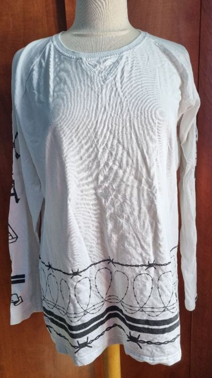 T-shirt à manches longues blanc à motifs noir, taille 2xl ,marque Woangle,longueur 73cm,largeur 52cm, longueur épaule à aisselle 22cm, longueur manche 74cm,légère tache voir dernière photo.