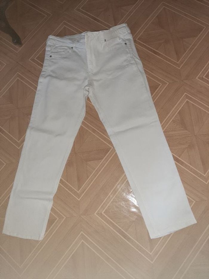 pantalon blanc 40 H&M effet reprisé au niveau des poches avant et arrière Très bon état (bien blanc....) dimensions car taille petit (j'indique donc 40 et non 42 comme mentionné sur l'étiquette) longueur totale 88 longueur à partir de l'entrejambe 63 98% coton/ 2% élastane. Effet reprisé sur plusieurs endroits. J'ai ajouté un bouton blanc pour plus d'aisance . Quasi neuf
