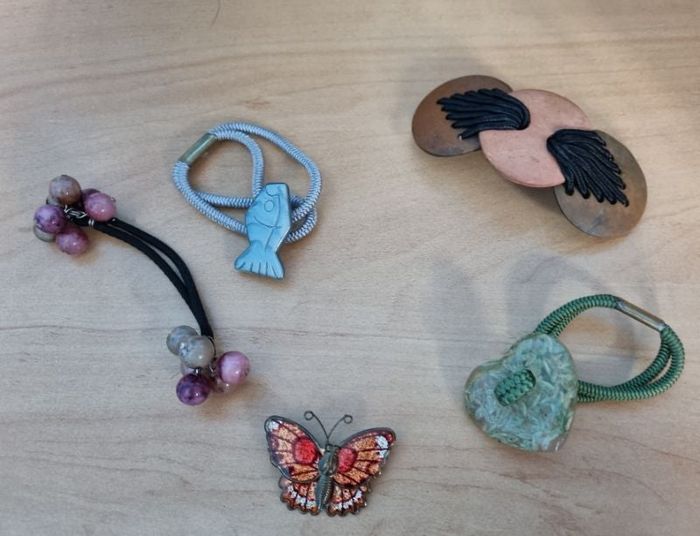 Lot 4 accessoires cheveux vintage + une broche à vêtement en forme de papillon.