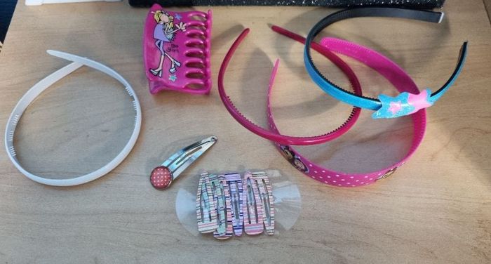 Lot de 7 accessoires cheveux fille, tout en très bonne état juste les 2 de la dernière photo qui sont en bonne état.
