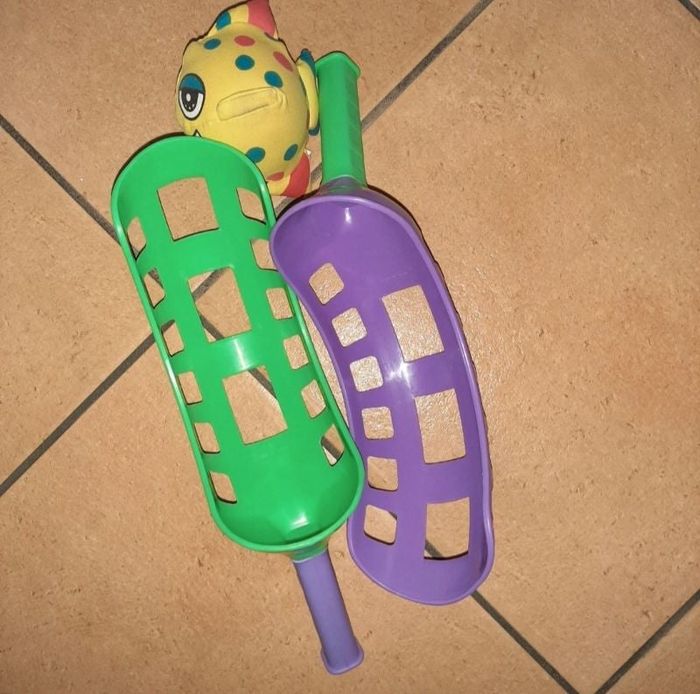 2 raquettes 1 balle en mousse (poisson) On peut jouer dans l'eau avec ce jeu. Raquettes plastique emboîtables.