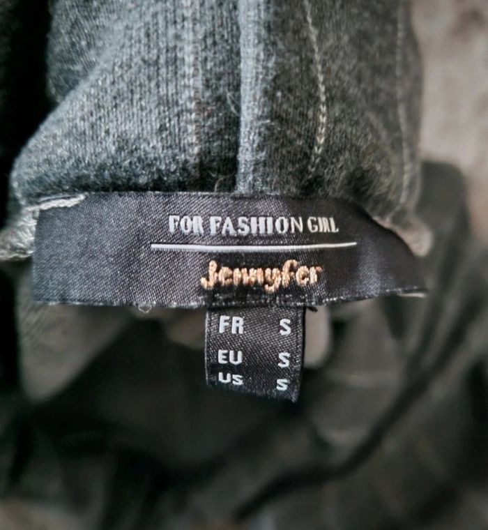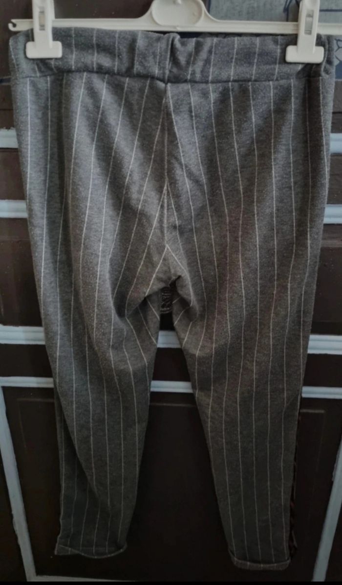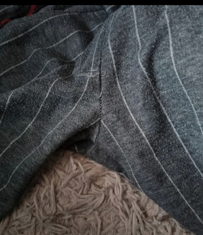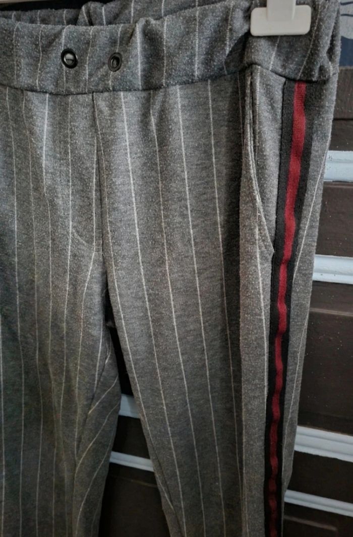 Pantalon gris à rayures taille S avec rayures noir et bordeaux sur les côtés, marque Jennyfer, manque le cordon à la taille mais il y à un élastique, longueur 89cm, largeur maximum de la taille 49cm cm, largeur de la taille 40cm, largeur cuisse 30cm.