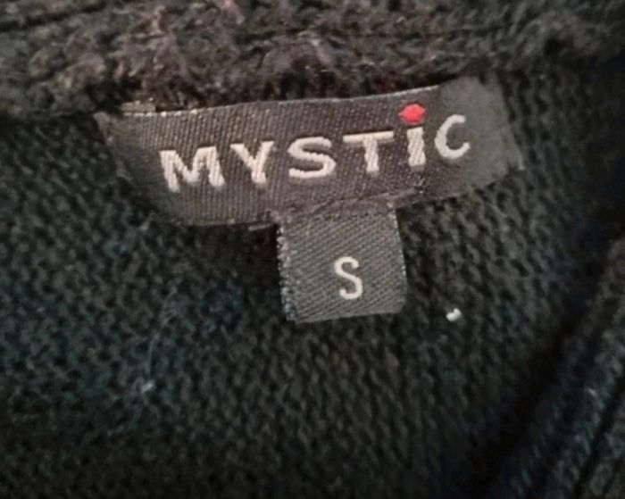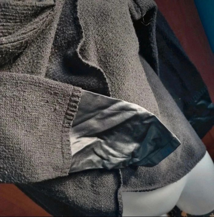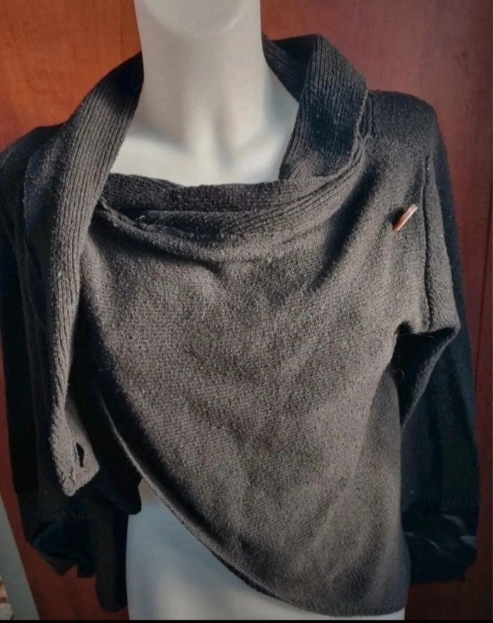 Petit cardigan noir style poncho, col tombant, faux cuir aux manches, taille S marque Mystic,longueur 60cm, largeur 47cm, longueur épaule à aisselle 20cm, longueur manche 57cm.