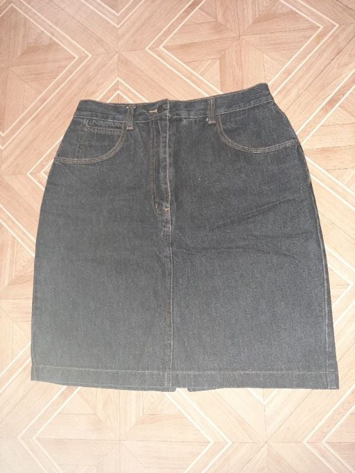 Jupe jean noire T 42 Gris foncé Coton Bouton et fermeture éclair Passants ceinture Dimensions prises à plat : Longueur 51 Largeur bas 49.