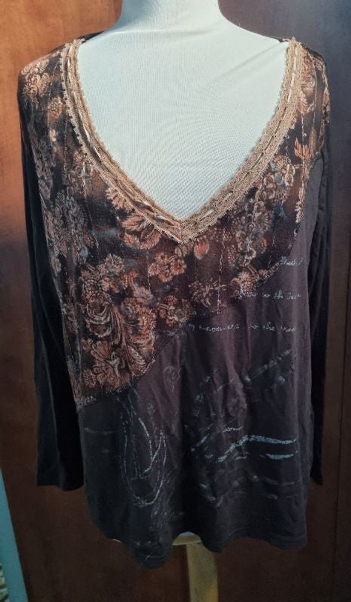 Pull léger a motifs fleurs taille 46 marque Votre Mode,longueur 62cm, largeur 56cm, longueur épaule à aisselle 19cm, longueur manche 57cm.