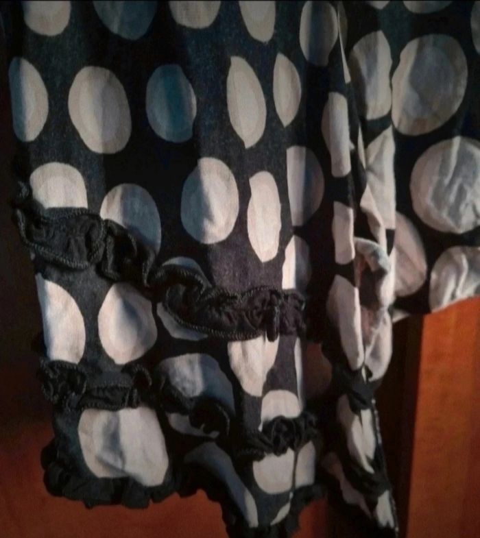 Tunique à motif pois et cœur taille 46/48,marque Patrice Breal,longueur 85cm,largeur 51cm, longueur épaule à aisselle 22cm.